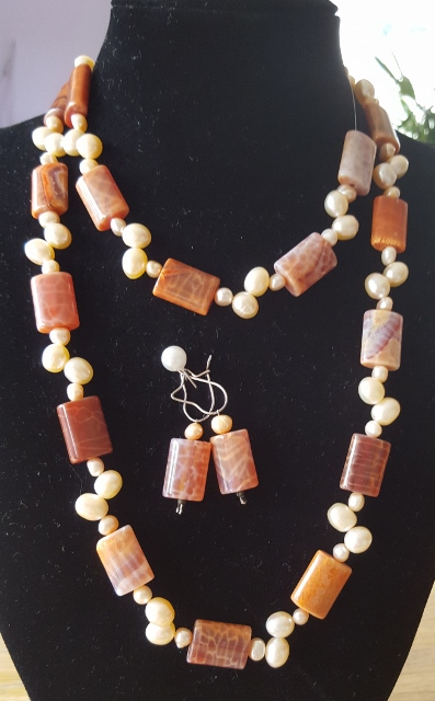 Slangen-Vuur-Agaat met Zoetwaterparel en zilver slotjes. Set bestaat uit Ketting, Armband en Oorbellen. De set wordt op maat gemaakt voor de betreffende persoon! Prijs € 65,00