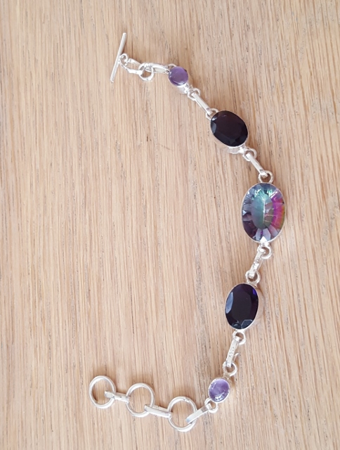 Zilver armband met Mystieke Topaas (Manmade) en op het einde 2 Amethistjes.