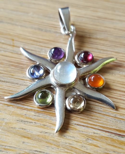Granaat, Carneool, Citrien, Peridoot, Ioliet, Amethist en Regenboogmaansteen in het midden