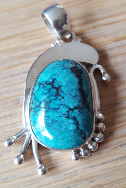Totale lengte ca. 5 cm x 3 cm breed, zonder oog ca. 4 x 3 cm (op zijn breedtste, steen 2.5×2 cm), in zilver gezet