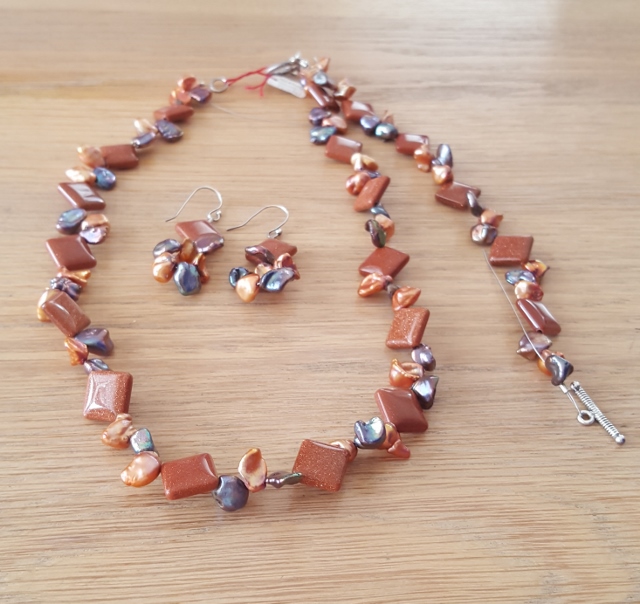 Goudsteen (Manmade) met Zoutwaterparel en zilver slotjes. Set bestaat uit Ketting, Armband en Oorbellen. De set wordt op maat gemaakt voor de betreffende persoon. Prijs € 59,00