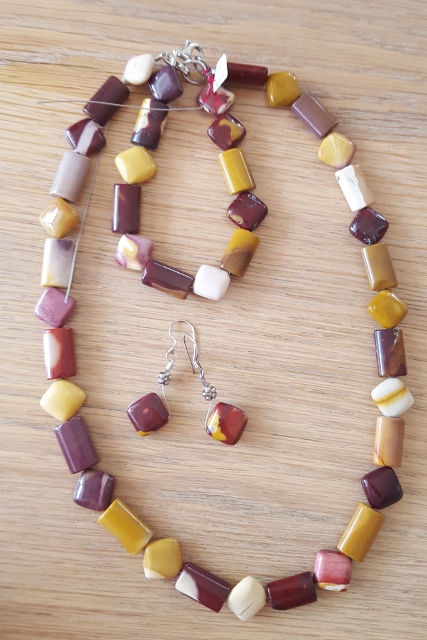 Mookaiet met zilver slotjes. Set bestaat uit Ketting, Armband en Oorbellen Prijs € 39.50