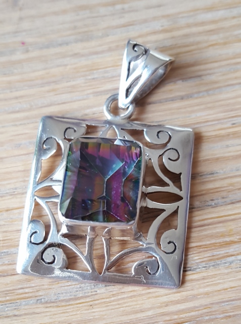 Totale lengte ca. 3.5 x 2.4 cm breed, zonder oog ca. 2.5 x 2.4 cm (steen 1.2×1, op zijn breedtste), in zilver gezet