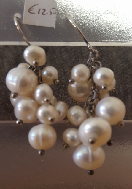 Oorhangers zoetwaterparel wit, totale lengte 4.7 cm, excl. haakjes 3.3 cm, max.breedte 2 cm., zilver