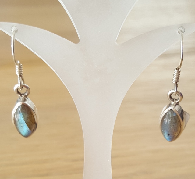 Oorhangers Labradoriet, totale lengte ca. 3 cm. excl. hangers 1.5 cm., breedte max. 0.7 cm.