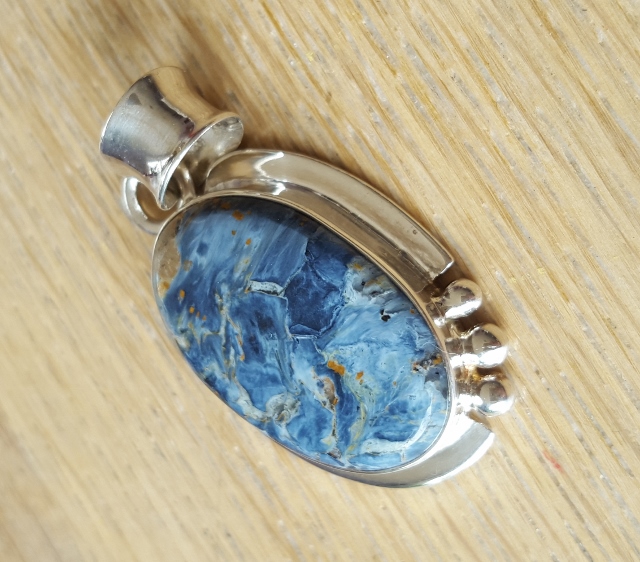 Totale lengte ca. 4.3 x 2,3 cm breed, zonder oog ca. 3 x 2.3 cm (op zijn breedtste), steen ca 2,5×1,6cm, in zilver gezet