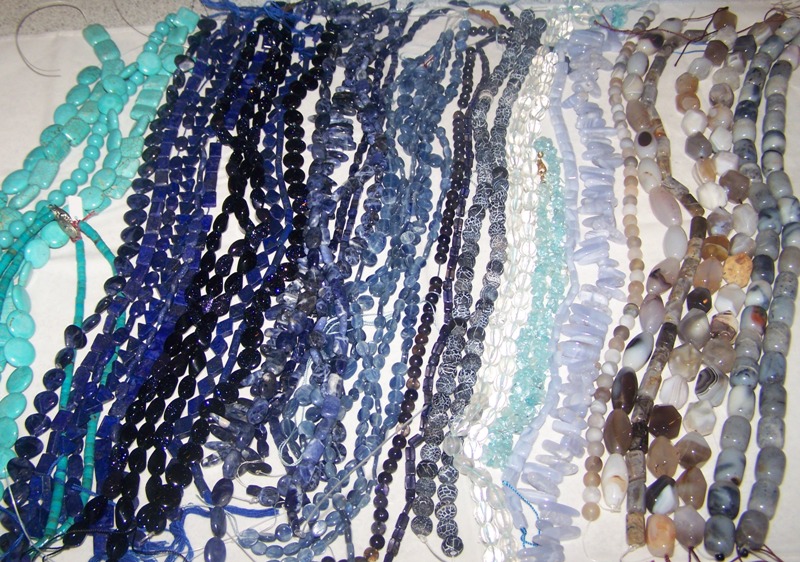 Diverse strengen stenen. 1 Streng is voldoende om 1 korte ketting te maken. Voor een setje (Ketting, Armband en Oorbellen) heb je 2 strengen nodig. De meeste strengen kosten € 12,50 p/stuk. Ook zijn er losse kralen verkrijgbaar.