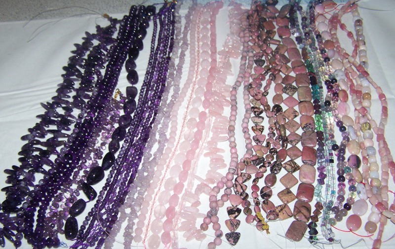 Diverse strengen stenen. 1 Streng is voldoende om 1 korte ketting te maken. Voor een setje (Ketting, Armband en Oorbellen) heb je 2 strengen nodig. De meeste strengen kosten € 12,50 p/stuk. Ook zijn er losse kralen verkrijgbaar.