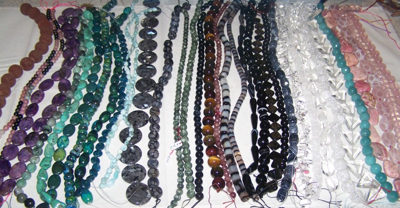 Diverse strengen stenen. 1 Streng is voldoende om 1 korte ketting te maken. Voor een setje (Ketting, Armband en Oorbellen) heb je 2 strengen nodig. Deze strengen zijn duurder en afhankelijk van steensoort en vorm. Prijs vanaf € 25,00 t/m € 125,00 p/streng