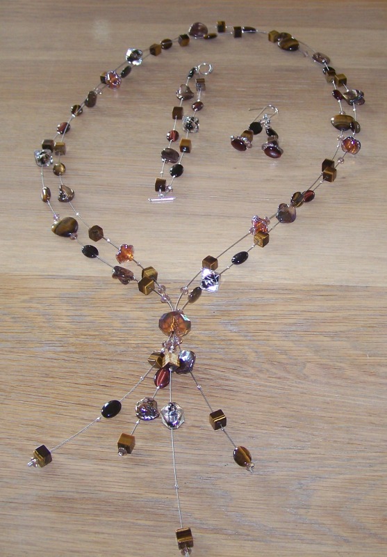 Tijger-Valke en Katteoog met zoetwaterparel en glaskralen lang met zilver slotjes. Set bestaat uit Ketting, Armband en Oorbellen. De set wordt op maat gemaakt voor de betreffende persoon! Prijs € 62.50