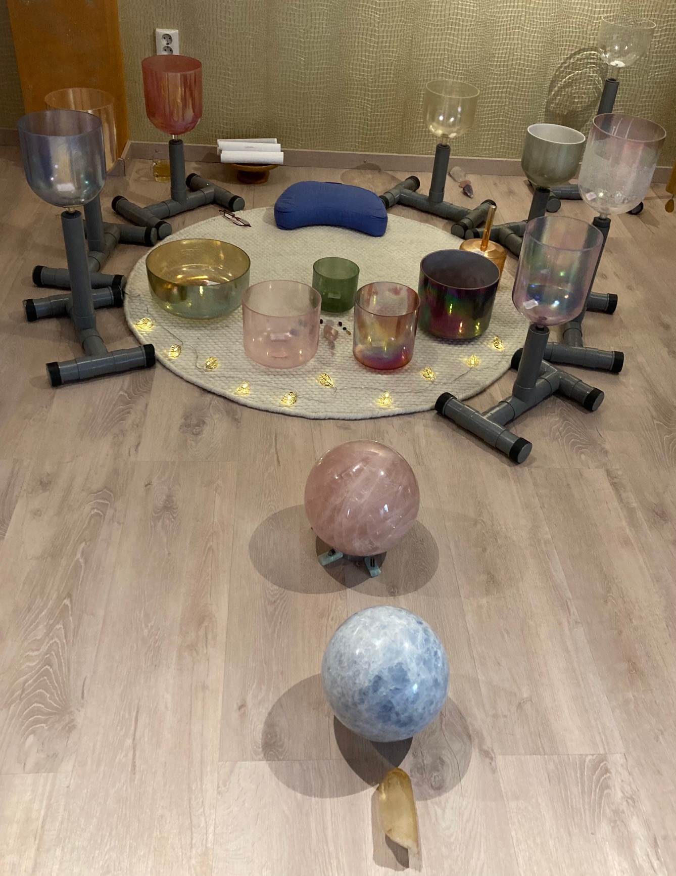 Stel je voor dat je 2 sets van glinsterende klankschalen van licht links en rechts van je ziet, doordrenkt met kostbare edelstenen, mineralen en metalen. Je gaat liggen, sluit je ogen en deze schalen worden aangedraaid en je lichaam wordt gevuld met een voortreffelijke vibratie van kristalhelder geluid. Elke cel in je lichaam begint te zingen. Je geest wordt rustig en stil. Je hart begint zich te openen. Je herinnert je wie je werkelijk bent.